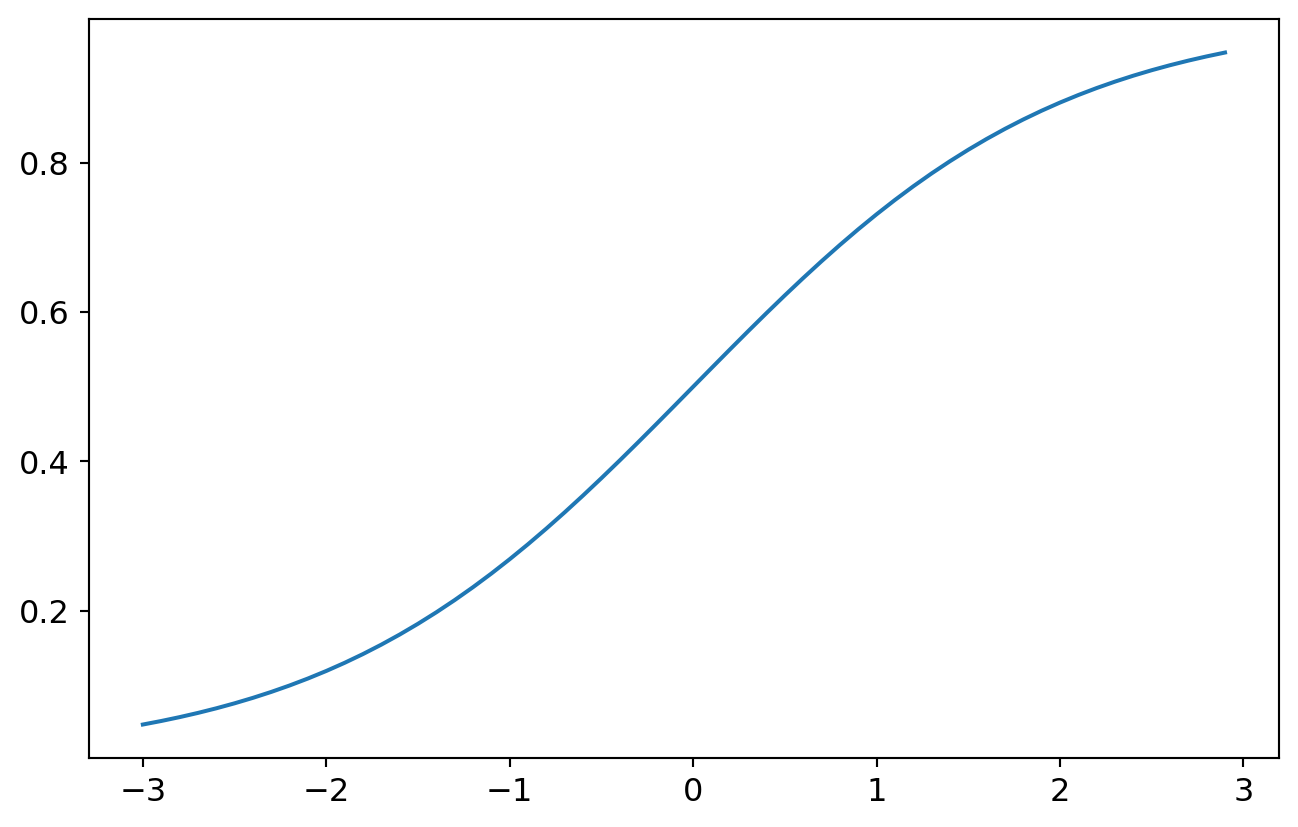 Show/Hide the code1 2 3 4 5 6 7 8 9 10import numpy as np import matplotlib.pyplot as plt def sigmoid(x): return 1 / (1 + np.exp(-x)) plt.plot(np.arange(-3, 3, 0.1), sigmoid(np.arange(-3, 3, 0.1))) plt.show()